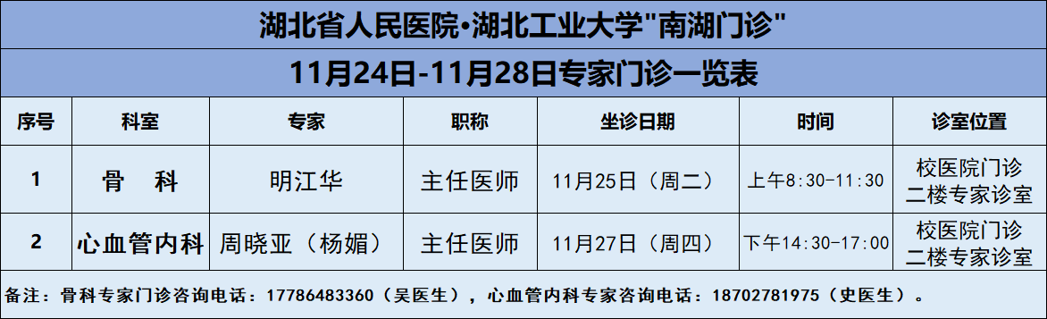 11月24日——11月28日,365体育彩票_中国体育彩票APP-投注|官网@医院将邀请湖北省人民医院知名专家——骨科明江华主任、心内科周晓亚主任两位专家教授前来校医院坐诊(具体坐诊信息见下)。请广大师生、周边居民持续关注南湖门诊专家坐诊信息,如有: